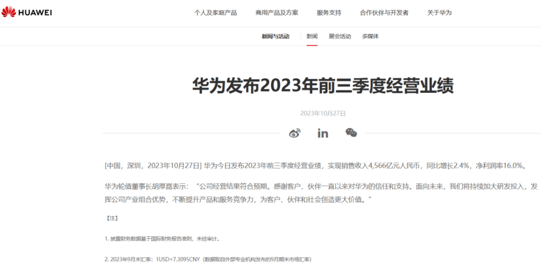 10月27日,华为在官网发布2023年前三季度经营业绩,前三季度公司实现销售收入4566亿元,同比增长2.4%,净利润率为16%。