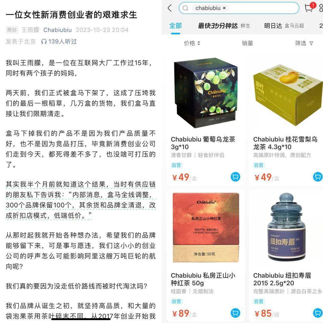 近日,一封名为《一位女性新消费创业者的艰难求生》的“控诉文章”在创投圈刷屏。文章出自高端原叶茶品牌Chabiubiu创始人王雨朦之手,她自称两天前公司的产品被盒马下架,成了压垮他们的最后一根稻草,“几万盒的货物,盒马直接让我们限期清走。”