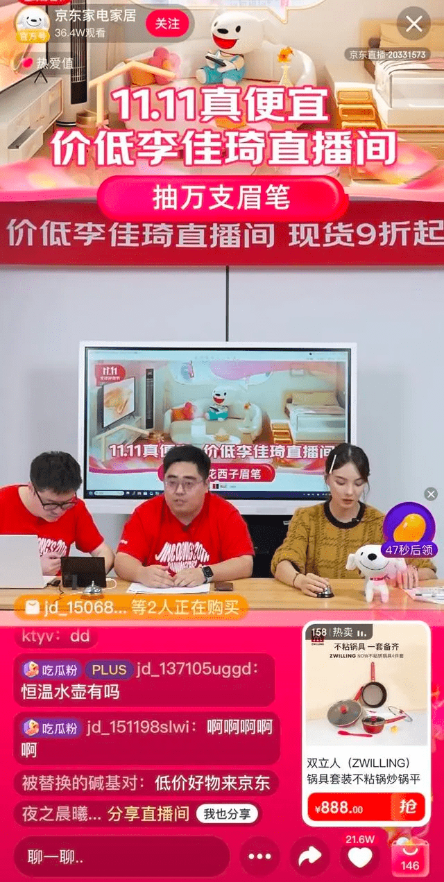 京东需要“碰瓷”李佳琦这波流量。10月25日京东在家电家具分区上线“价低李佳琦直播间”,该直播间内的商品以家电、家居用品为主。另外,据主播介绍,直播间推出了抽一万支花西子眉笔的活动。