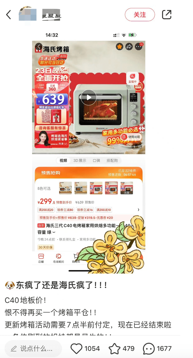 在小红书上,多位博主纷纷晒出了自己的战绩。有博主发帖称,“赶上了这波地板价,恨不得再买一个烤箱平仓。”