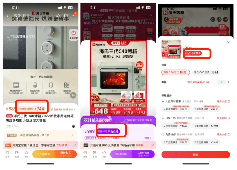 据悉,卷入这场京东、李佳琦直播间、品牌方三方争议产品为“海氏三代C40升级款家用入门烤箱”,其正常售价为每台799元,在李佳琦直播间折扣售价为每台648元。但在京东自营渠道,同款产品从促销价每台639元,一度直降至319.5元,甚至最低下触至每台299.5元,五折低价引发消费者抢购。
