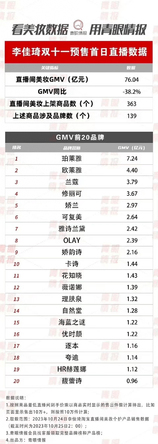 但预售首日数据来看,李佳琦直播间的“流量魔法”正在退散。根据第三方数据平台青眼情报数据显示,10月25日“双十一”预售首日,李佳琦直播间共上架363个商品,单价从几十元至上万元不等。双十一预售首日,李佳琦直播间美妆GMV为76亿元,GMV同比下滑38.2%。