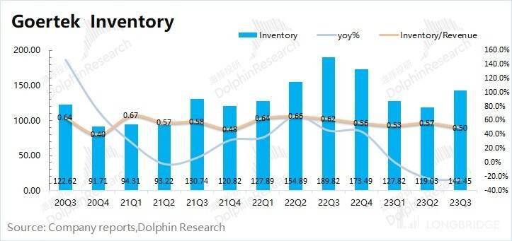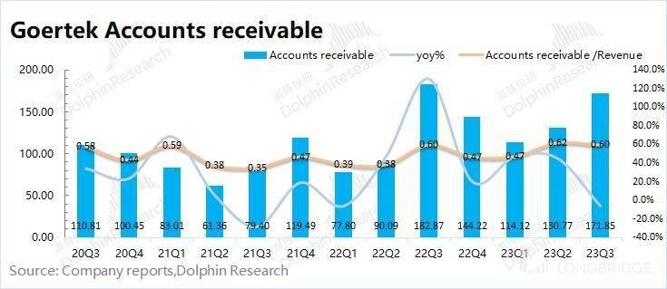 ①应收帐款:歌尔股份 2023 年第三季度应收帐款 171.85 亿元,同比增长 46.7%。从应收帐款/营业收入指标看,歌尔股份本季度为 0.6,仍在相对偏高的水位。