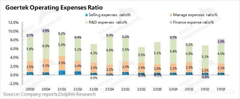 二、费用及经营情况:存货基本去化,利润或将好转。歌尔股份 2023 年第三季度存货 142.45 亿元,同比下滑 25%。经过前期的库存去化,歌尔当前的存货整体水位处于相对偏低的位置。公司本季度的核心四项费用率为 8.2%,主要是公司今年以来进行了明显的降本控费。财务费用以外的其他费用均已明显得到控制。