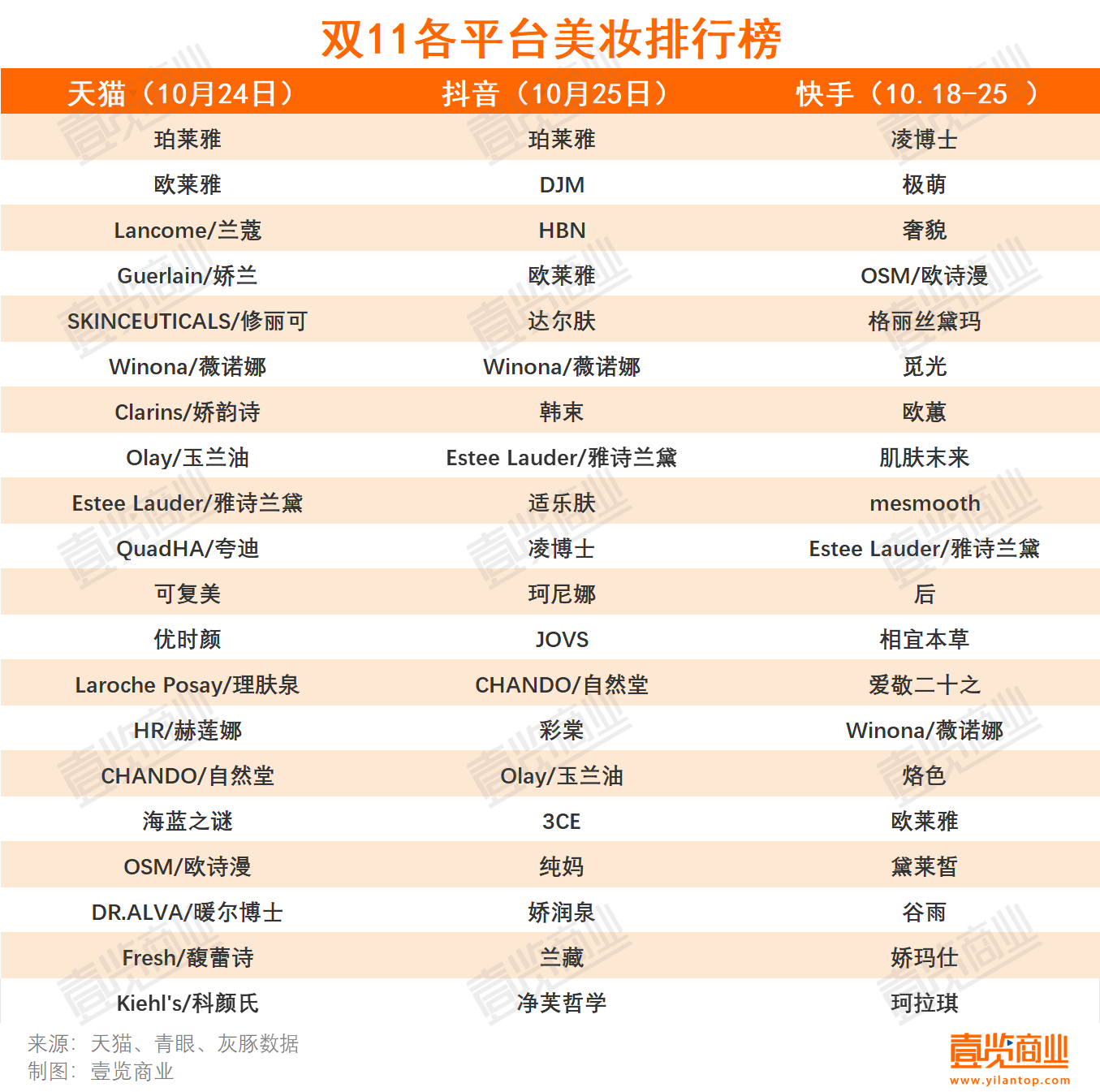 10月25日,天猫官方平台“天猫大美妆”发布了《天猫快速消费品双11预售首日品牌榜单》(根据10月24日20:00- 23:59预售定金情况测算出预售有效成交金额),结合10月18日抢跑的快手、10月20日开卖的抖音,可窥见美妆行业在今年双11的新变化。