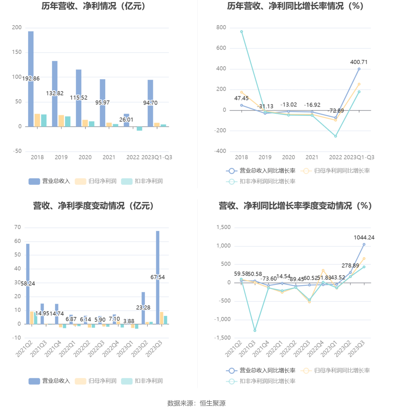 根据三季报,公司第三季度实现营业总收入67.54亿元,同比增长1044.24%,环比增长190.15%;归母净利润8.88亿元,同比增长659.67%,环比增长447.30%;扣非净利润6.04亿元,同比增长431.91%,环比增长247.04%。