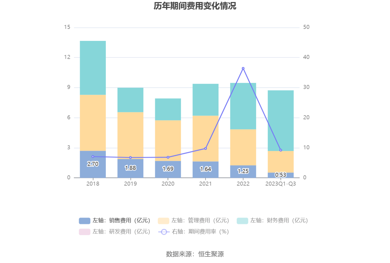 2023年前三季度,公司期间费用为8.72亿元,较上年同期增加2.07亿元;但期间费用率为9.21%,较上年同期下降25.95个百分点。其中,销售费用同比下降32.11%,管理费用同比增长9.14%,财务费用同比增长54.79%。