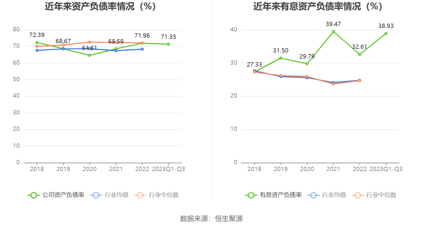 在偿债能力方面,公司2023年三季度末资产负债率为71.35%,相比上年末下降3.07个百分点;有息资产负债率为38.93%,相比上年末上升6.32个百分点。