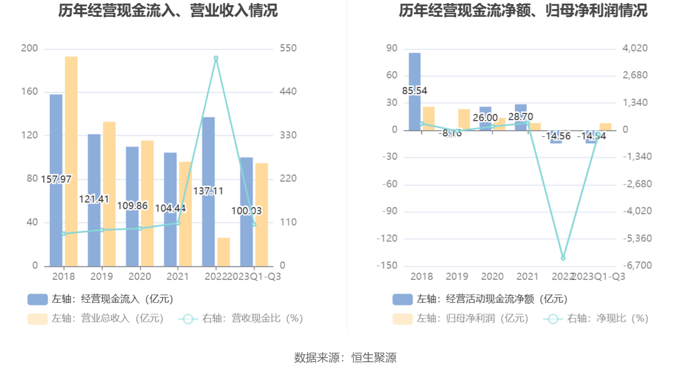 2023年前三季度,公司经营活动现金流净额为-14.54亿元,同比减少46.77亿元,主要系报告期内公司支付的各项税费以及购买商品、接受劳务支付的现金较上年同期增加所致;筹资活动现金流净额1.70亿元,同比增加17.31亿元;投资活动现金流净额17.18亿元,上年同期为-1.61亿元。