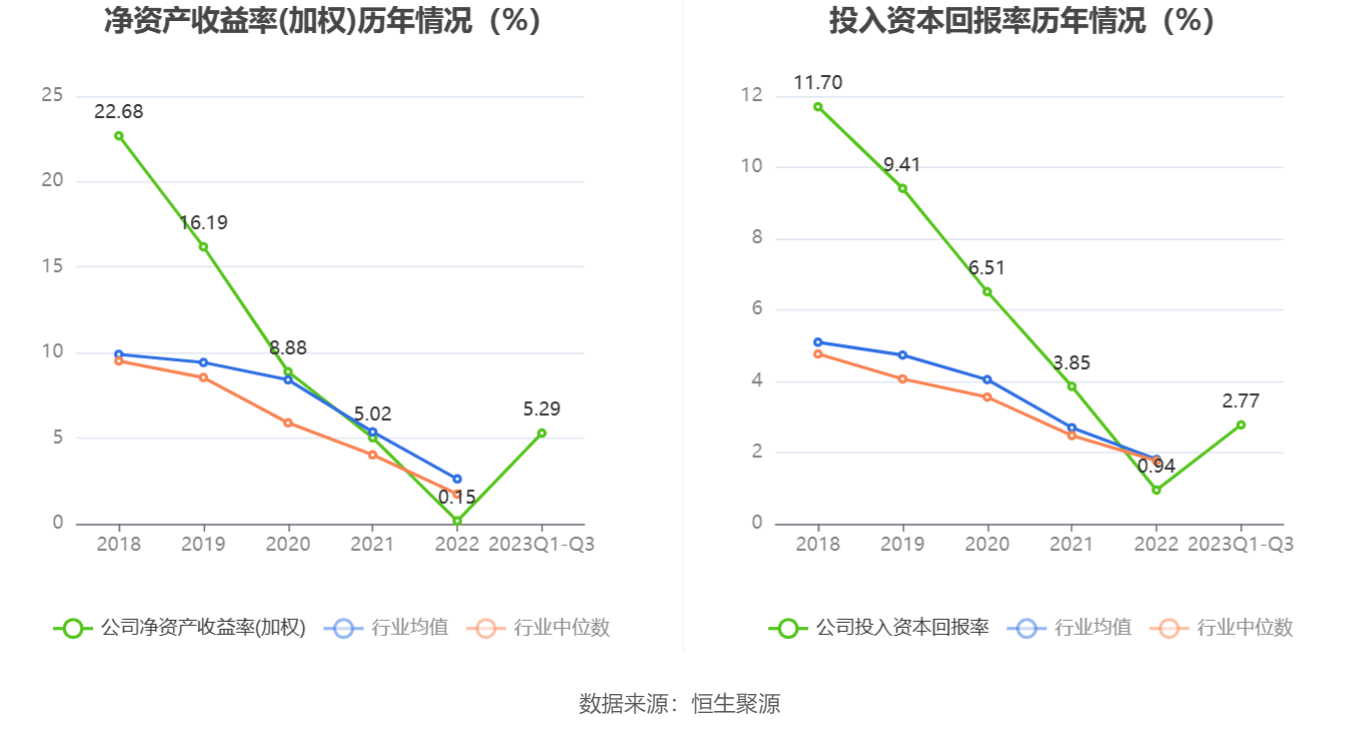 数据显示,2023年前三季度公司加权平均净资产收益率为5.29%,较上年同期增长8.34个百分点;公司2023年前三季度投入资本回报率为2.77%,较上年同期增长3.18个百分点。