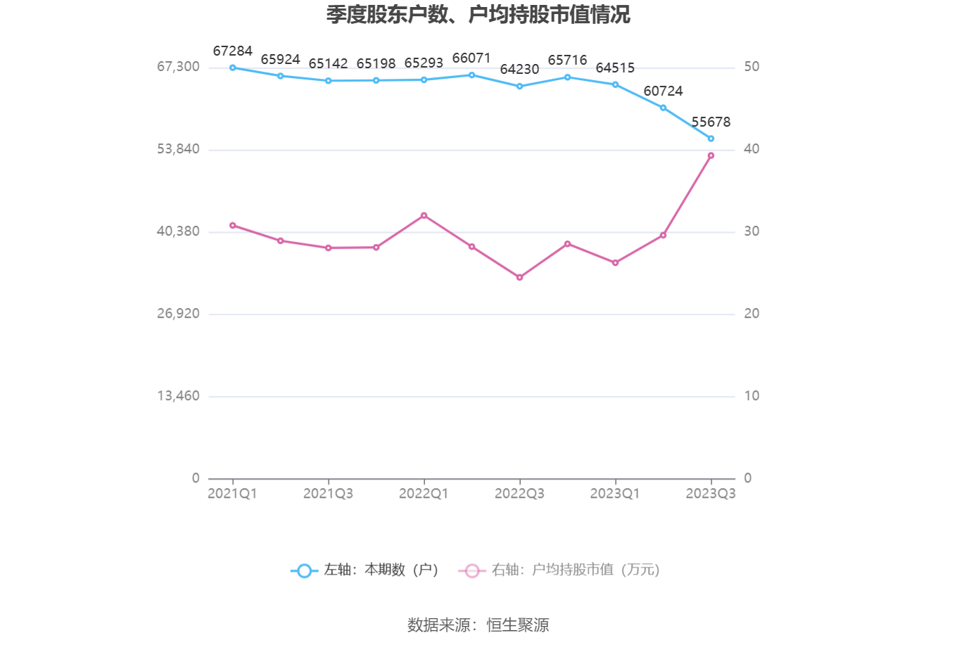 筹码集中度方面,截至2023年三季度末,公司股东总户数为5.57万户,较上半年末下降了5046户,降幅8.31%;户均持股市值由上半年末的29.62万元上升至39.31万元,增幅为32.71%。