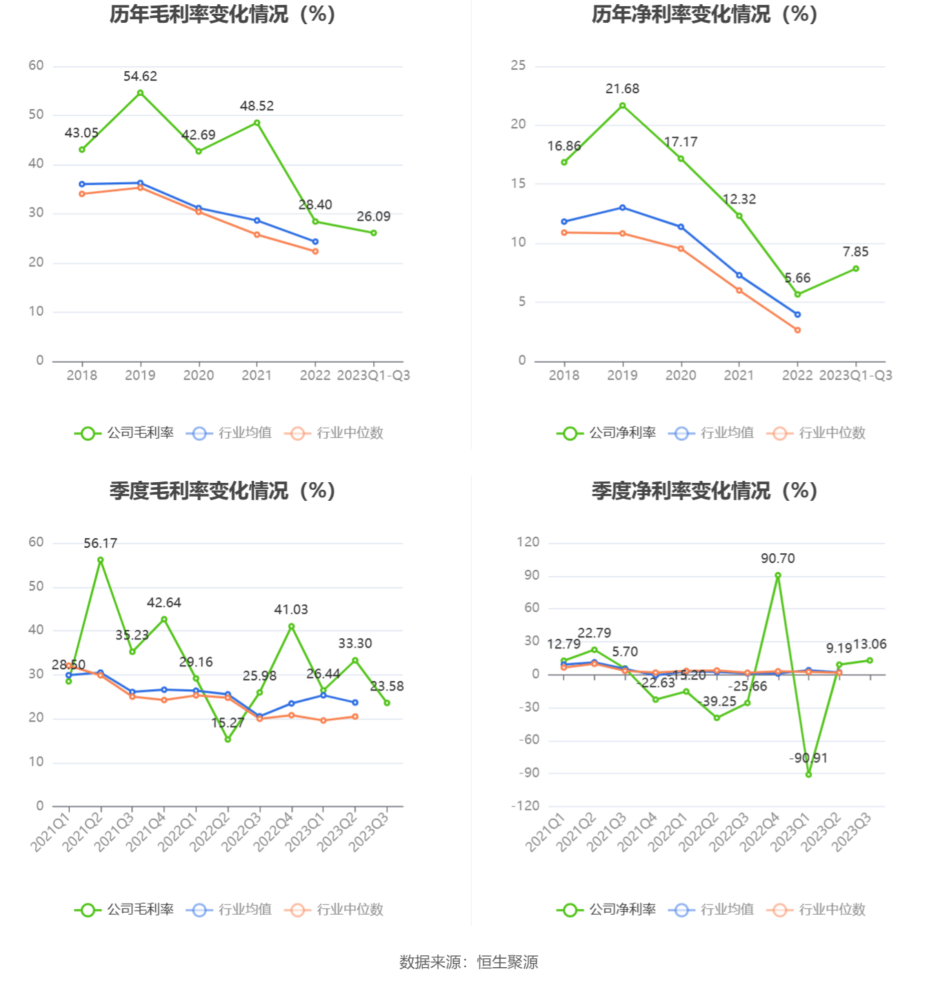 2023年前三季度,公司毛利率为26.09%,同比上升2.43个百分点;净利率为7.85%,较上年同期上升34.13个百分点。从单季度指标来看,2023年第三季度公司毛利率为23.58%,同比下降2.40个百分点,环比下降9.72个百分点;净利率为13.06%,较上年同期上升38.72个百分点,较上一季度上升3.87个百分点。
