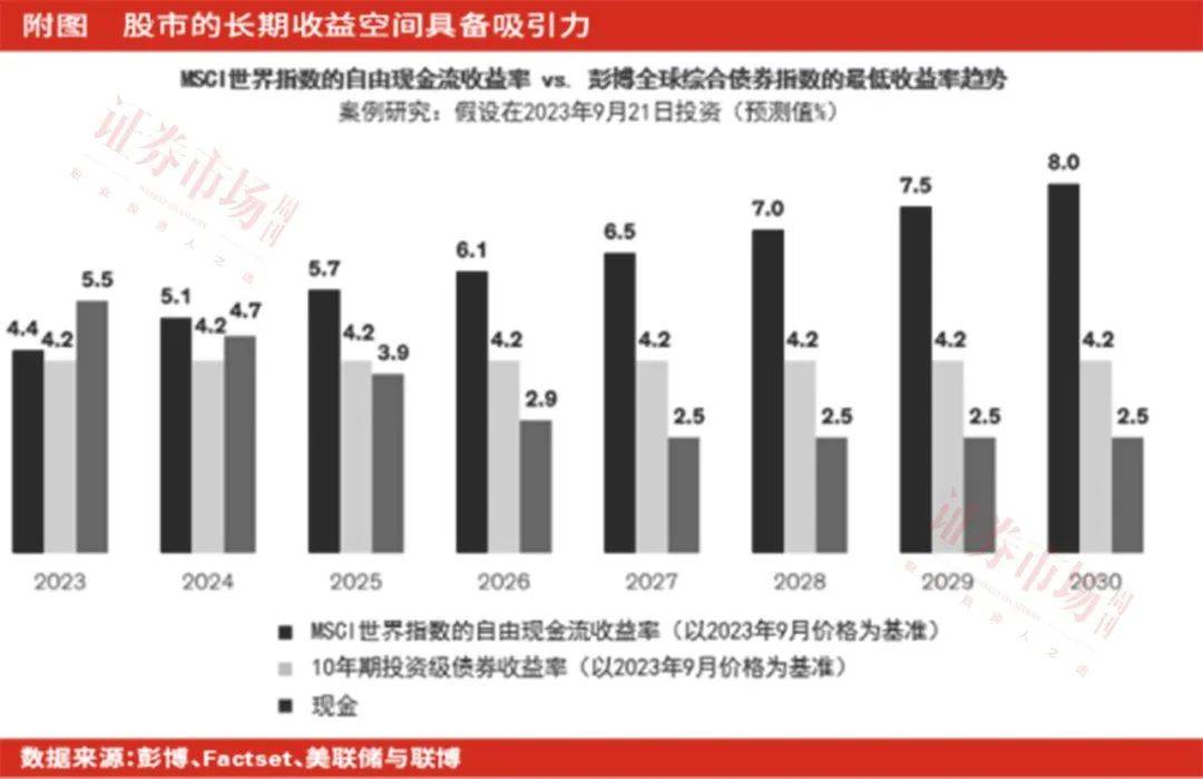 目前全球股票的自由现金流收益率低于公司债或现金,但放眼长期,情况则有所不同。根据市场预期,投资者若配置全球股票,只需要等待1年,自由现金流收益率便能有望逼近跟踪公司债的彭博全球综合债券指数。如果再把时间拉长,联博预计两者差距将进一步拉大。