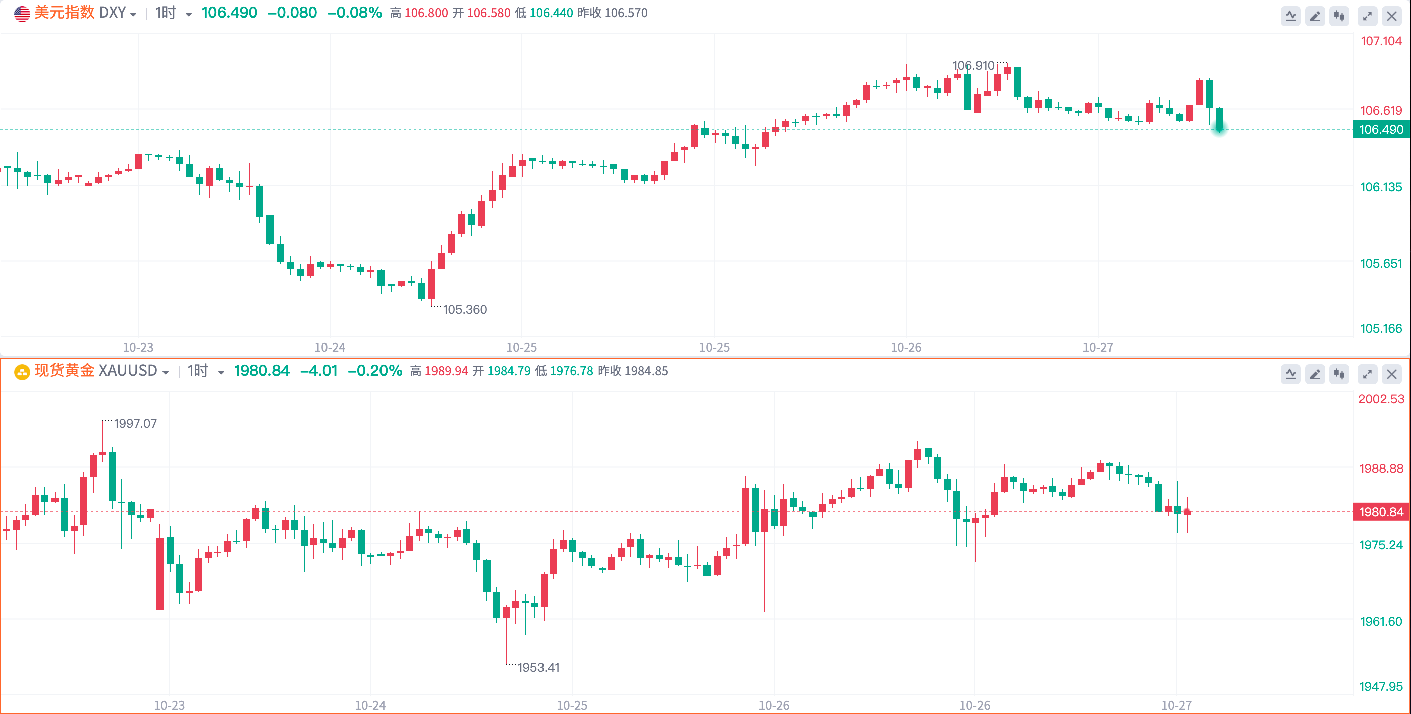 美元指数本周整体录得上涨。周一美元指数于美盘时段大幅跳水,跌破106关口,周二重回106上方并持续上涨,周四一度逼近107关口。