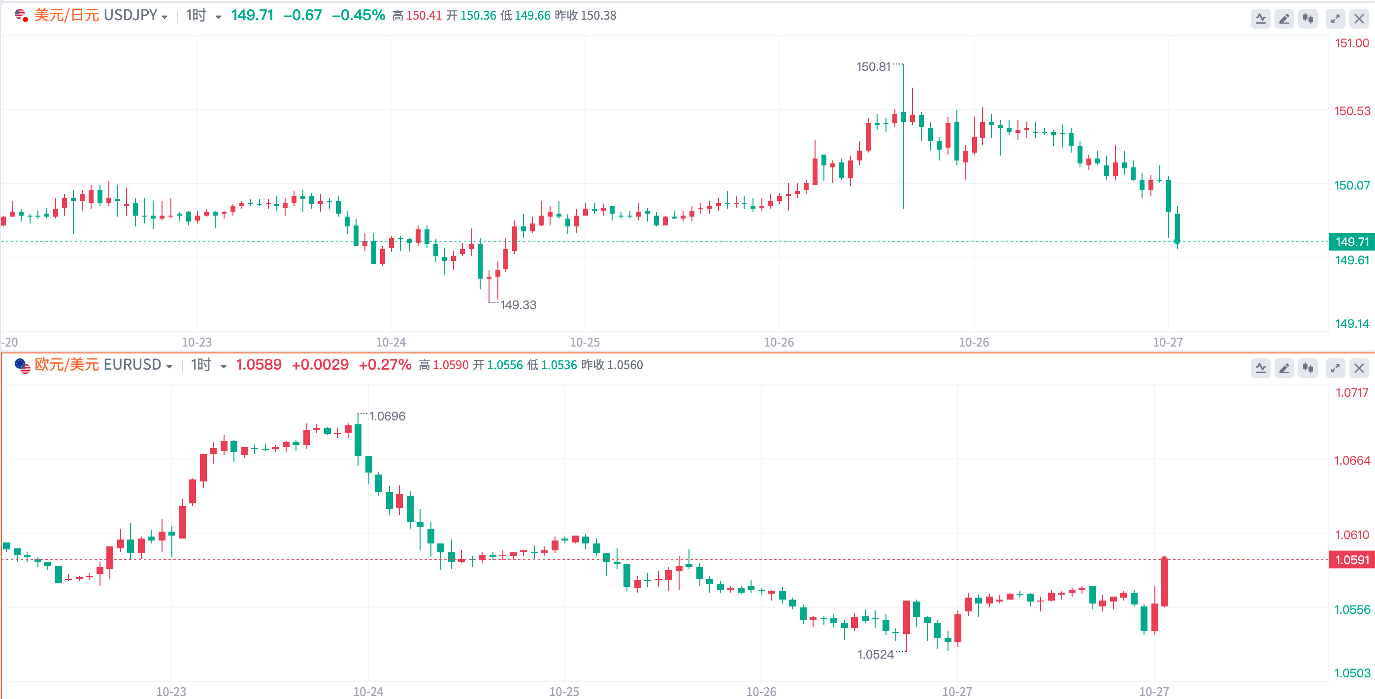 受美国和日本利差影响,美元兑日元本周再度短暂涨破150,最高向上触及150.81,随后快速回落。欧洲央行暂停加息,欧元兑美元最低触及1.0524。