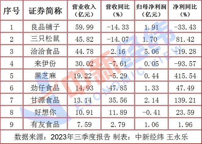 从营业收入来看,前三季度,良品铺子、三只松鼠、洽洽食品、来伊份、黑芝麻、劲仔食品、甘源食品、好想你、有友食品营收分别为59.99亿元、45.82亿元、44.78亿元、30.02亿元、19.22亿元、14.93亿元、13.14亿元、 10.91亿元、7.59亿元。