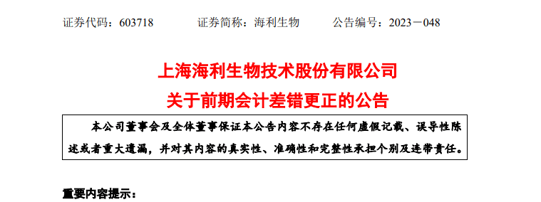 基于上述两项情况,海利生物2023年半年度报告中营业收入、投资收益、净利润、股东权益等科目存在差错。其中,公司上半年的营收需调减900万元,净利润调增3705.93万元,扣非后的净利润调减1397.8万元,基本每股收益调增0.0576元。