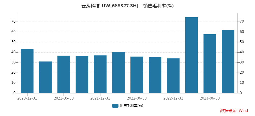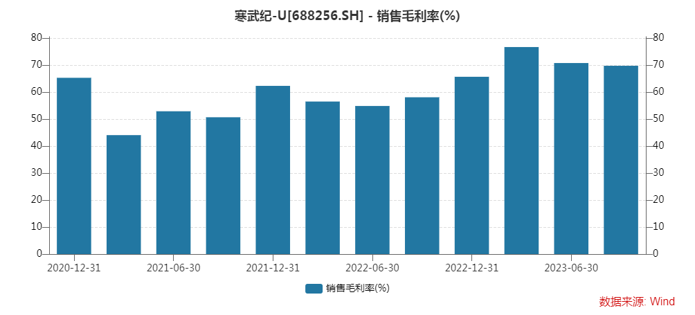 今年三季度,寒武纪销售毛利率为69.84%,同比增长11.68个百分点,环比小幅回落1.02个百分点。