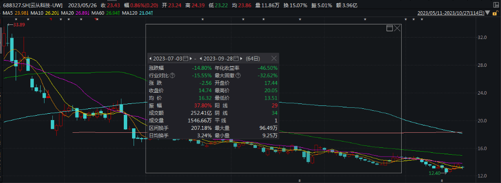 今年三季度,云从科技股价累计下跌14.80%,截至9月最后一个交易日,寒武纪收盘价为14.74元。截至今日收盘,云从科技股价为13.25元,市值137亿元。