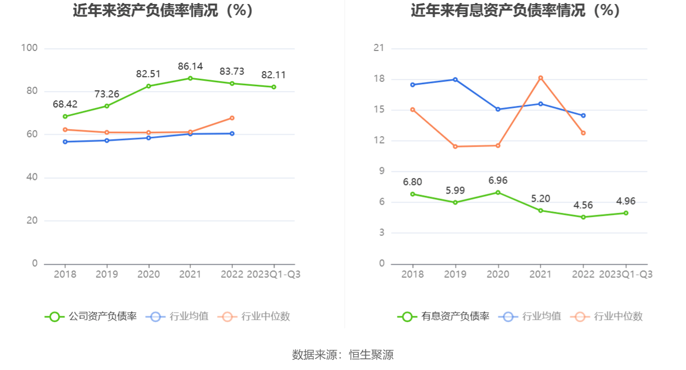 在偿债能力方面,公司2023年三季度末资产负债率为82.11%,相比上年末下降1.62个百分点;有息资产负债率为4.96%,相比上年末上升0.40个百分点。