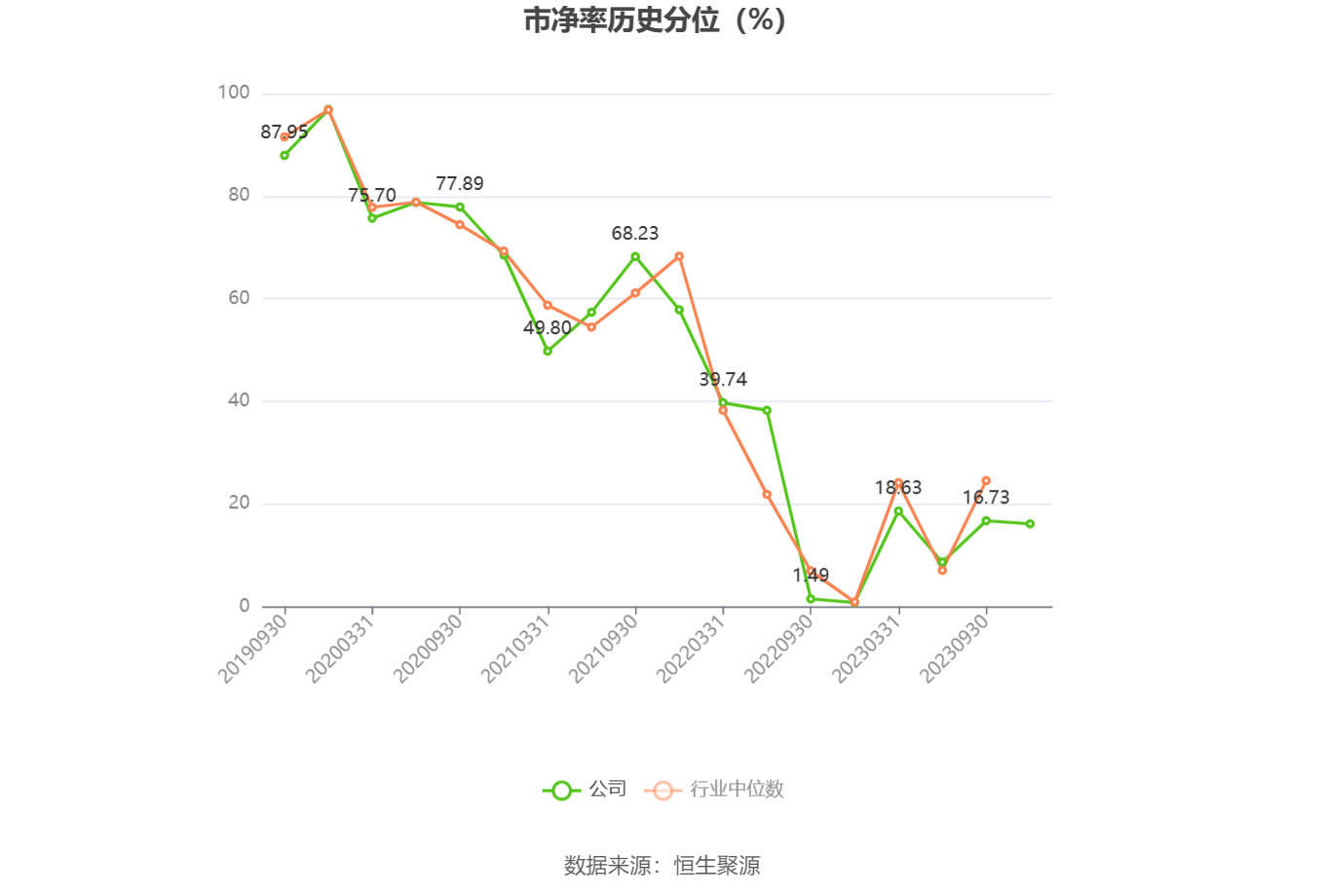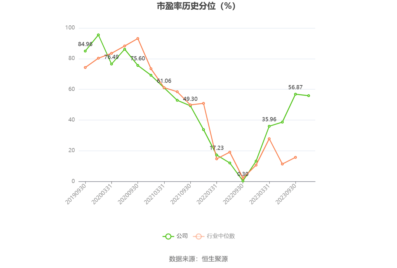 市盈率为负时,不显示当期分位数,会导致折线图中断。