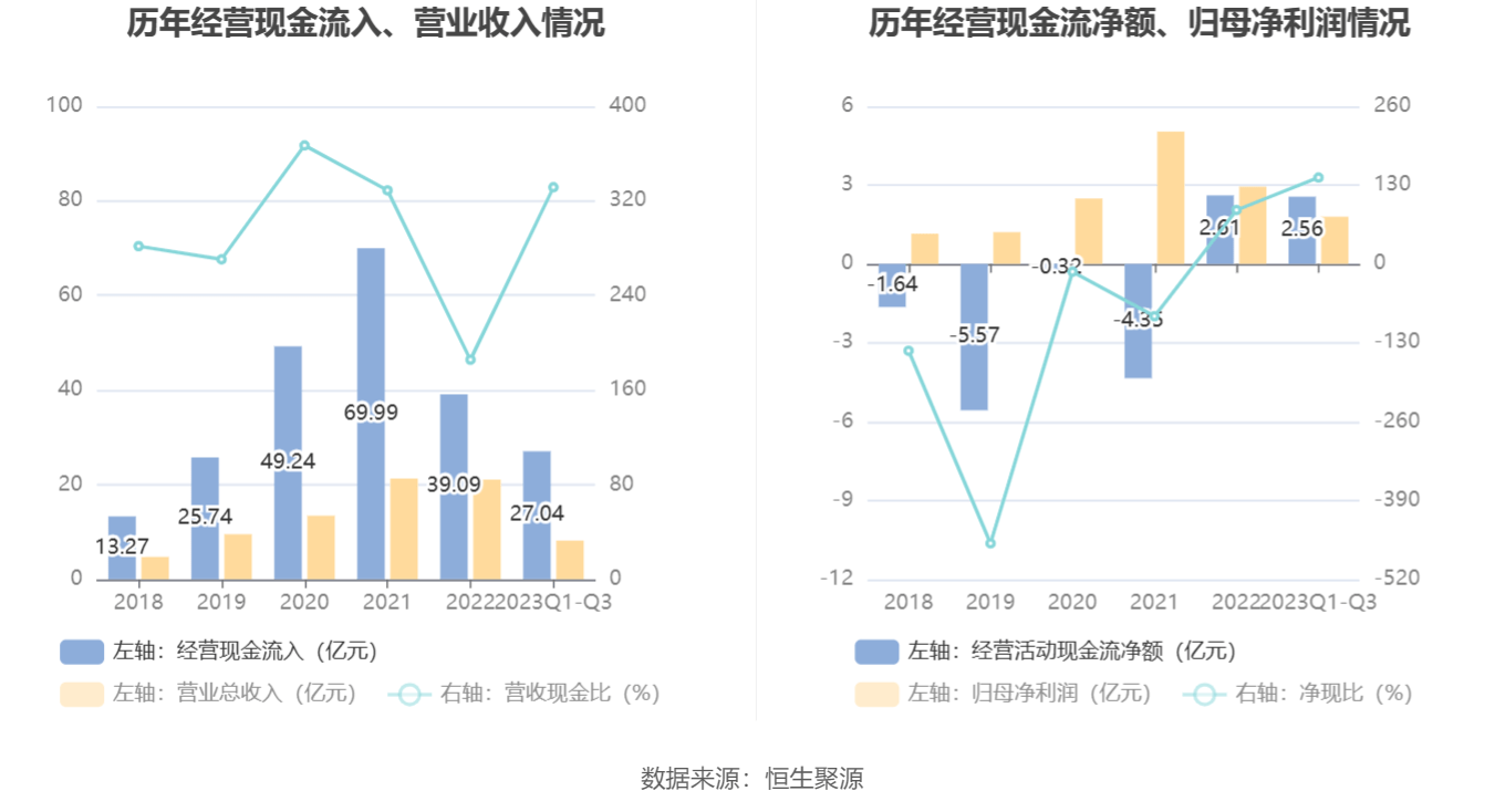 2023年前三季度,公司营业收入现金比为331.53%,净现比为142.54%。