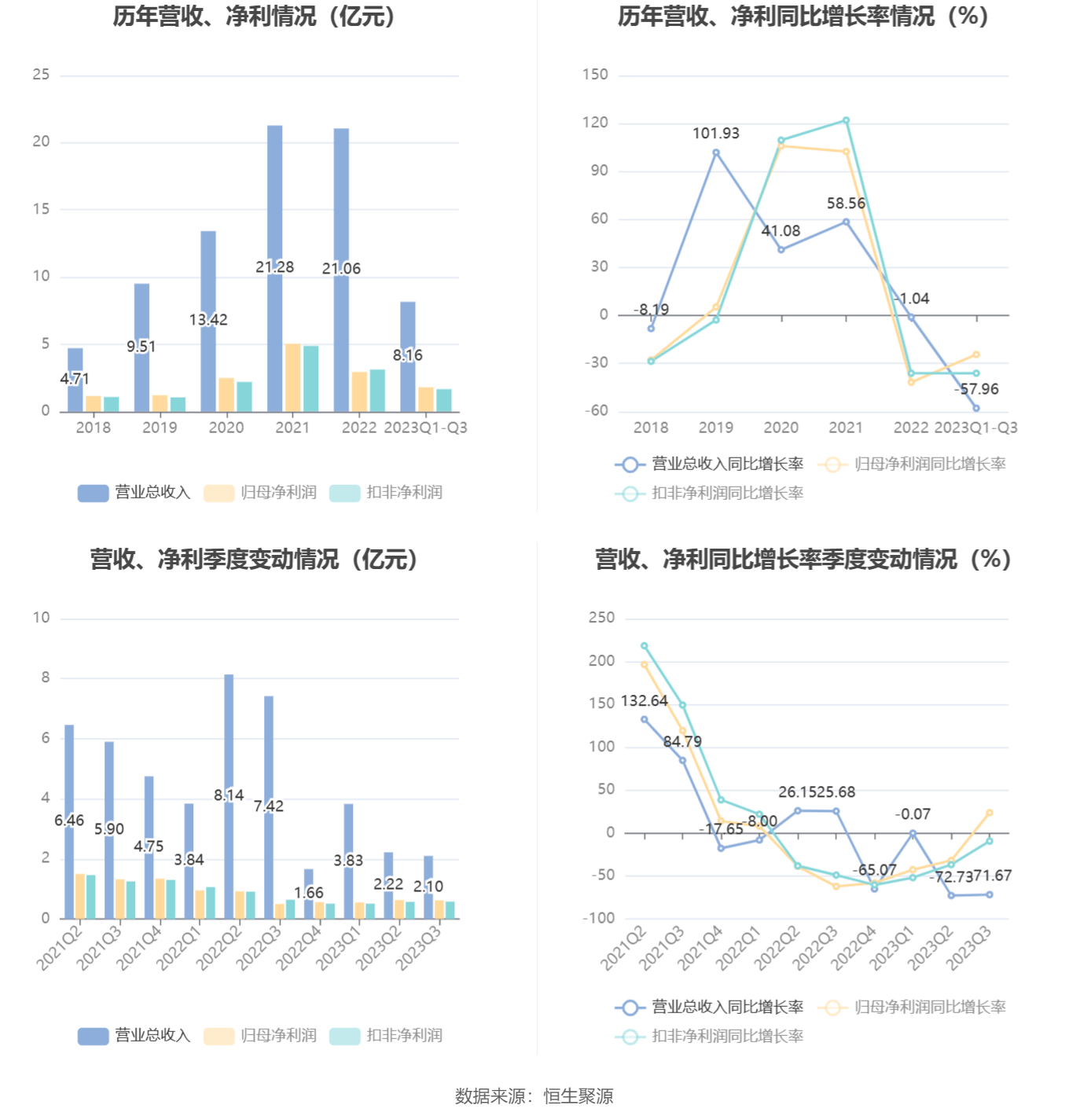 根据三季报,公司第三季度实现营业总收入2.1亿元,同比下降71.67%,环比下降5.39%;归母净利润6220.54万元,同比增长23.85%,环比下降0.68%;扣非净利润5813.94万元,同比下降9.26%,环比增长1.43%。