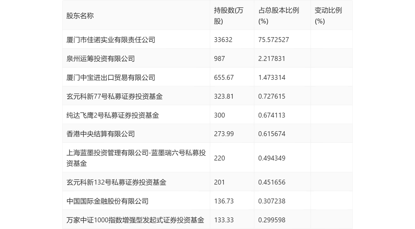 三季报显示,2023年三季度末公司十大流通股东中,新进股东为香港中央结算有限公司、中国国际金融股份有限公司、万家中证1000指数增强型发起式证券投资基金,取代了上半年末的纯达飞鹰1号私募证券投资基金、纯达贝利1号私募证券投资基金、南方金融主题灵活配置混合型证券投资基金。在具体持股比例上,纯达飞鹰2号私募证券投资基金持股有所上升,厦门市佳诺实业有限责任公司、玄元科新132号私募证券投资基金持股有所下降。