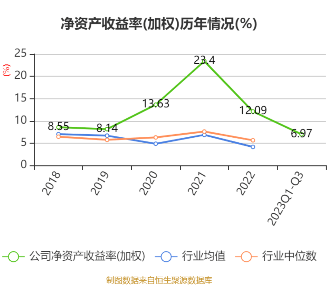 盈利能力方面, 2023年前三季度公司加权平均净资产收益率为6.97%,同比下降2.85个百分点。