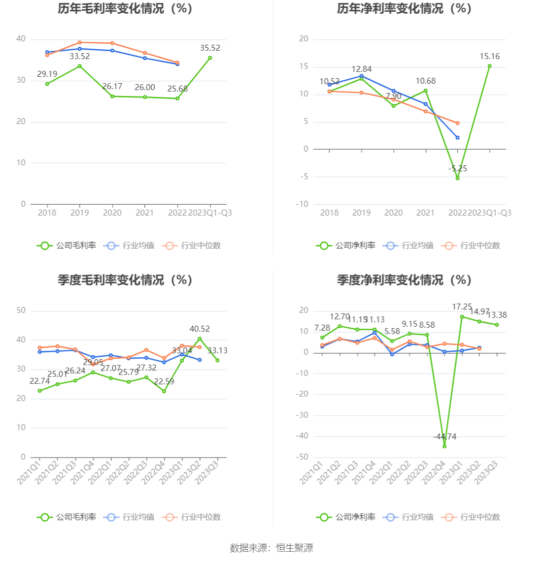 2023年前三季度,公司毛利率为35.52%,同比上升8.81个百分点;净利率为15.16%,较上年同期上升7.35个百分点。从单季度指标来看,2023年第三季度公司毛利率为33.13%,同比上升5.81个百分点,环比下降7.39个百分点;净利率为13.38%,较上年同期上升4.80个百分点,较上一季度下降1.59个百分点。