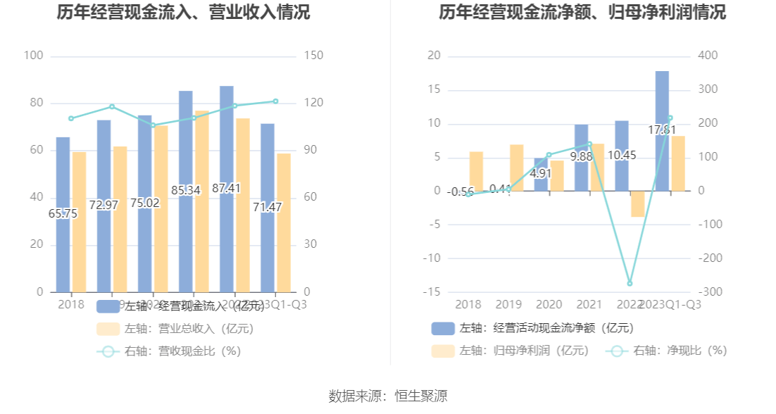 2023年前三季度,公司营业收入现金比为121.49%,净现比为217.70%。