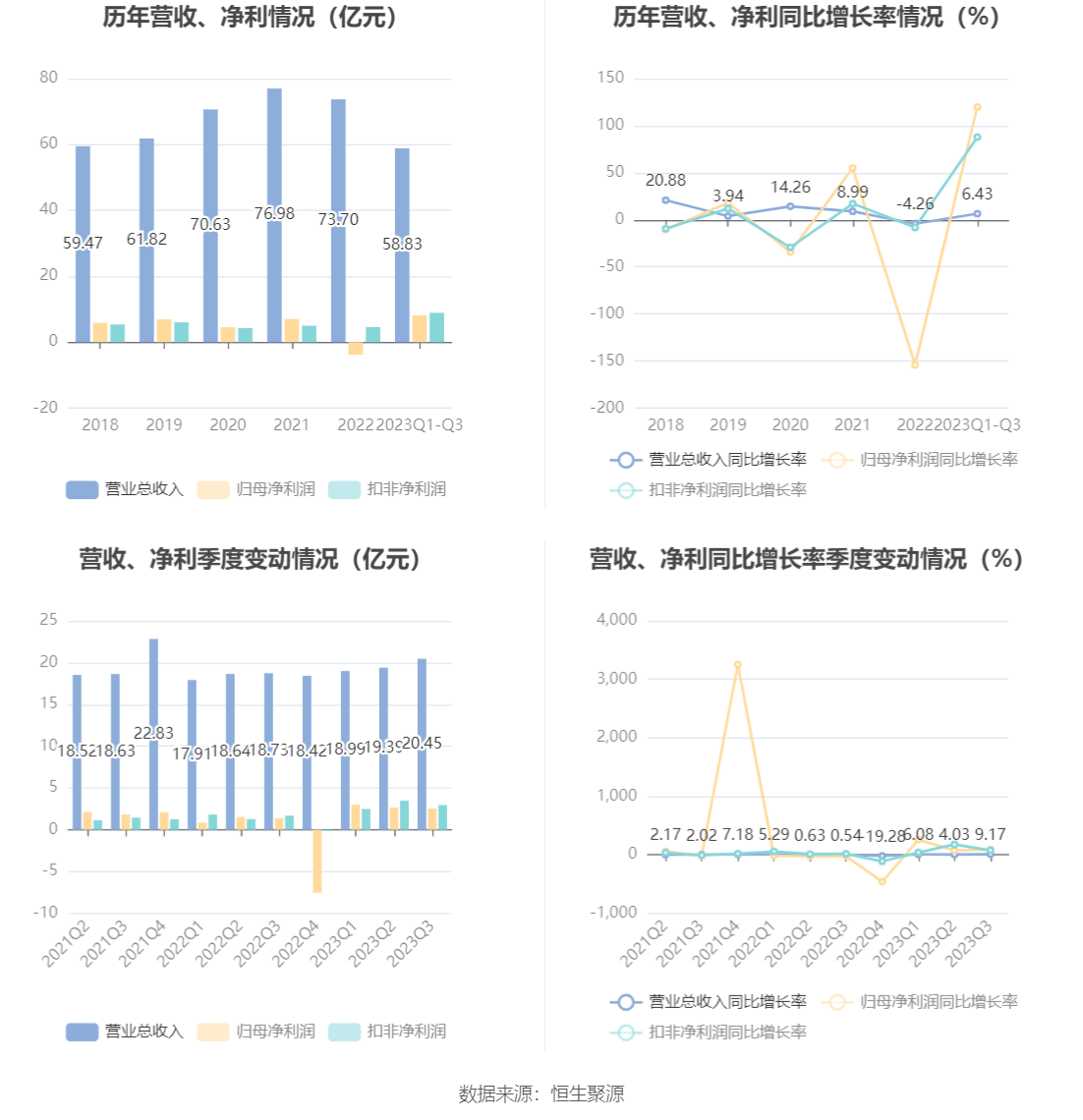 根据三季报,公司第三季度实现营业总收入20.45亿元,同比增长9.17%,环比增长5.48%;归母净利润2.54亿元,同比增长86.39%,环比下降4.44%;扣非净利润2.94亿元,同比增长75.58%,环比下降15.20%。