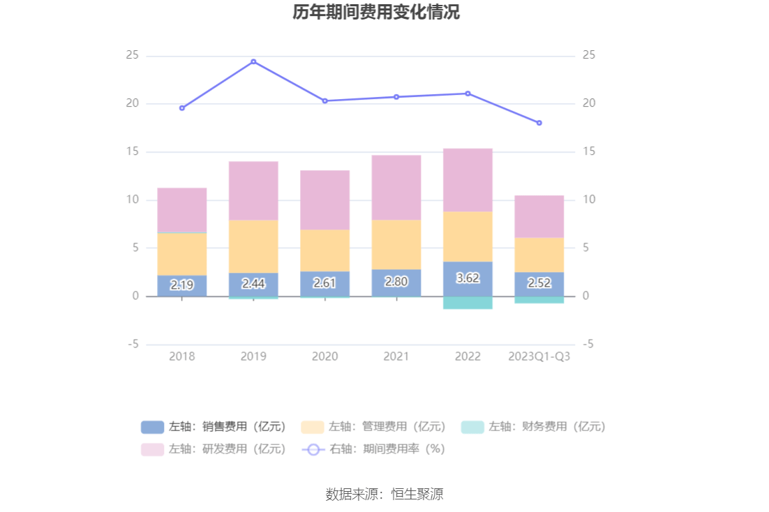 2023年前三季度,公司期间费用为9.76亿元,较上年同期增加4052.07万元;但期间费用率为18.03%,较上年同期下降0.65个百分点。其中,销售费用同比下降0.44%,管理费用同比下降1.29%,研发费用同比下降1.8%,财务费用由去年同期的-1.28亿元变为-7347.96万元。