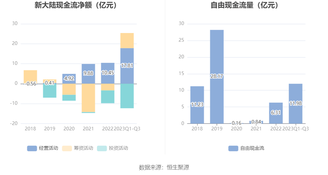 进一步统计发现,2023年前三季度公司自由现金流为11.98亿元,相比上年同期增长4894.64%。