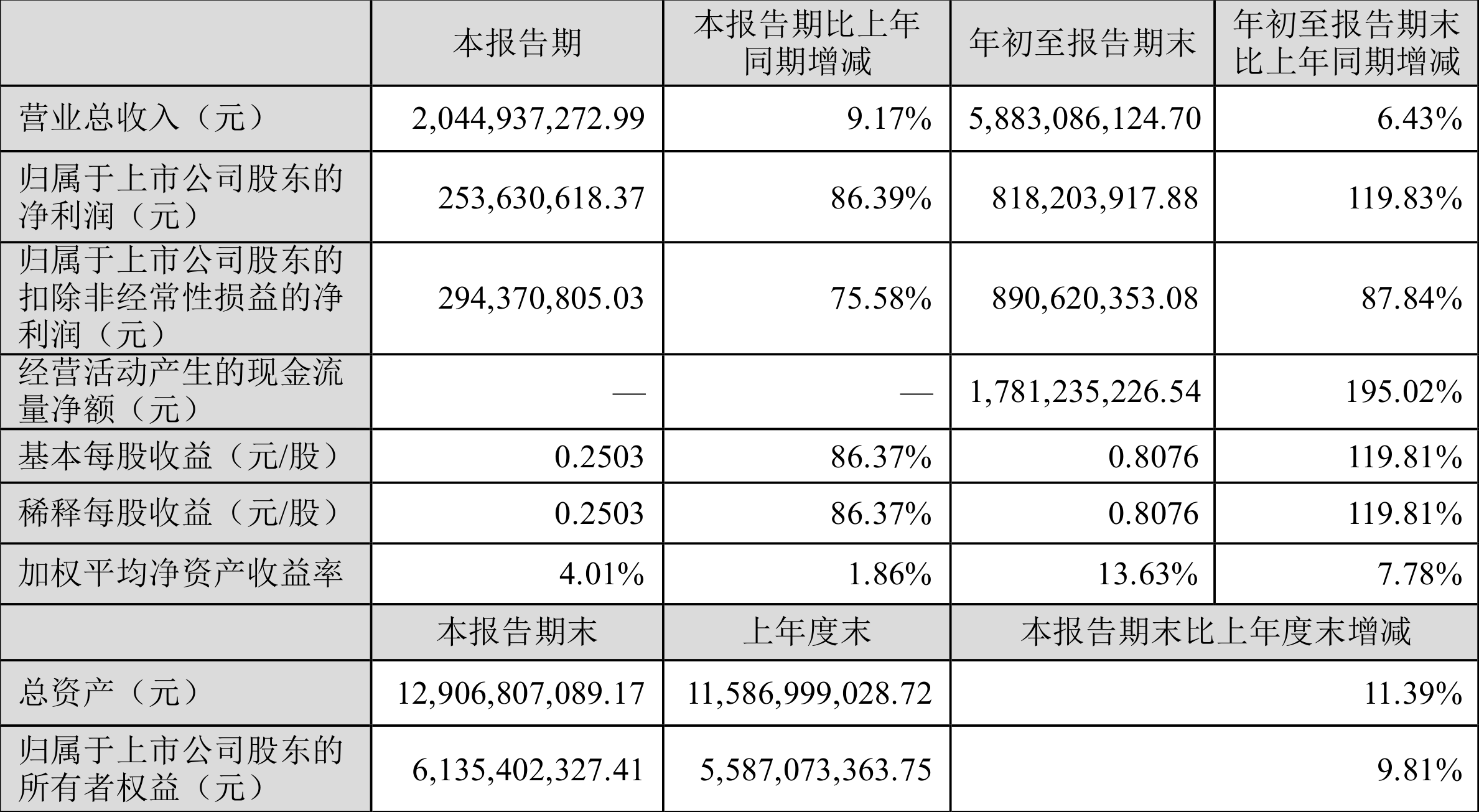 数据显示,2023年前三季度公司加权平均净资产收益率为13.63%,较上年同期增长7.78个百分点;公司2023年前三季度投入资本回报率为10.70%,较上年同期增长5.71个百分点。