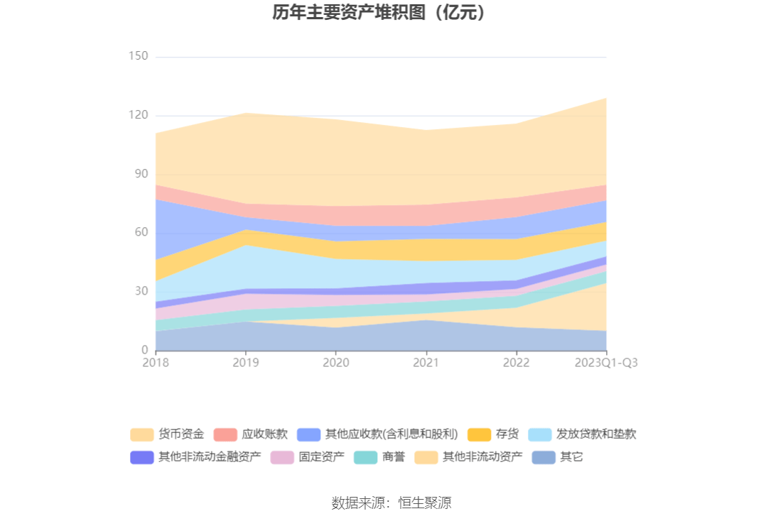 资产重大变化方面,截至2023年三季度末,公司其他非流动资产较上年末增加146.08%,占公司总资产比重上升10.32个百分点;发放贷款和垫款较上年末减少23.43%,占公司总资产比重下降2.82个百分点;应收账款较上年末减少21.01%,占公司总资产比重下降2.53个百分点;货币资金较上年末增加17.97%,占公司总资产比重上升1.92个百分点。
