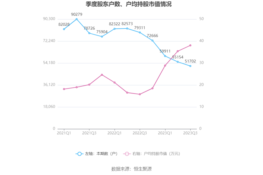筹码集中度方面,截至2023年三季度末,公司股东总户数为5.17万户,较上半年末下降了3452户,降幅6.26%;户均持股市值由上半年末的35.37万元上升至38.03万元,增幅为7.52%。