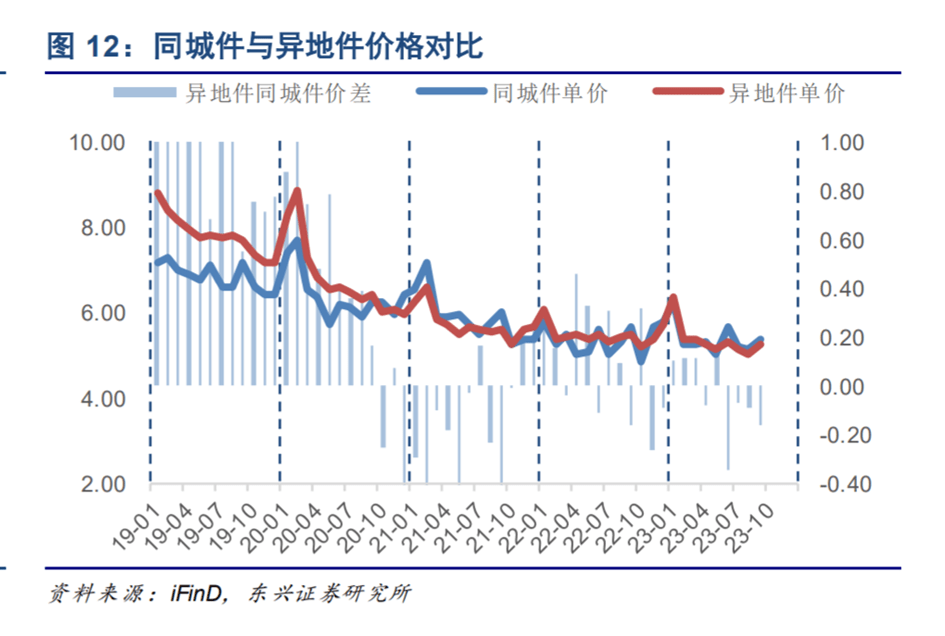 根据东兴证券整理数据,从2019年1月以来,国内快递不管是同城件还是异地件单价,都在震荡中持续走低。但是在2023年9月进入快递旺季后,降价幅度正逐步缩小。