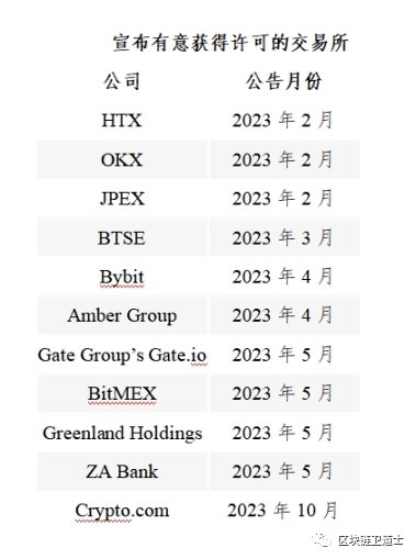 香港最初宣布推动虚拟资产时,引起了与中国大陆有联系的交易所的兴趣。OKX 和 HTX 均表示正在寻求许可证。除了四家正式申请者之外,还有更多公司表示正在寻求获得许可。OKX 首席商务官 Lennix Lai 上个月在 X(前身为 Twitter)上表示,该公司的申请正在「稳步推进」,预计将于本月提交。