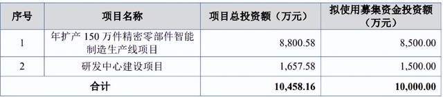 阿为特的招股说明书显示,公司拟募集资金10,000.00万元,用于年扩产150万件精密零部件智能制造生产线项目、研发中心建设项目。