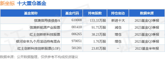 持有新坐标最多的基金为信澳信用债债券A,目前规模为68.24亿元,最新净值1.039(10月27日),较上一交易日上涨1.07%,近一年下跌5.14%。该基金现任基金经理为张旻。