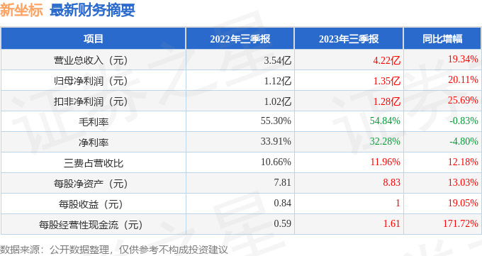 据证券之星公开数据整理,近期新坐标(603040)发布2023年三季报。根据财报显示,本报告期中新坐标营收净利润同比双双增长。截至本报告期末,公司营业总收入4.22亿元,同比上升19.34%,归母净利润1.35亿元,同比上升20.11%。按单季度数据看,第三季度营业总收入1.5亿元,同比下降1.8%,第三季度归母净利润4111.09万元,同比下降12.01%。
