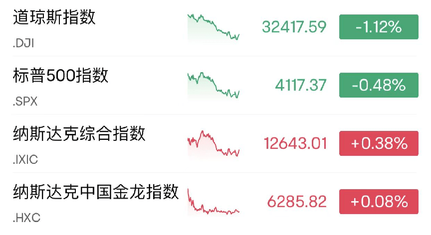 当地时间10月27日,美股三大股指涨跌不一,标普500指数正式进入回调区域。截至收盘,道指跌1.12%,报32417.59点;标普500指数跌0.48%,报4117.37点;纳指涨0.38%,报12643.01点。