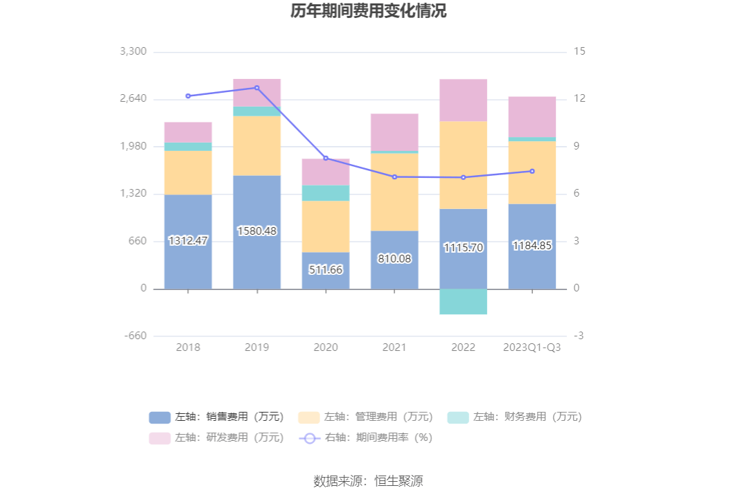 2023年前三季度,公司期间费用为2677.65万元,较上年同期增加1189.49万元;期间费用率为7.45%,较上年同期上升1.98个百分点。其中,销售费用同比增长47.85%,管理费用同比增长23.81%,研发费用同比增长27.58%,财务费用由去年同期的-458.30万元变为58.42万元。