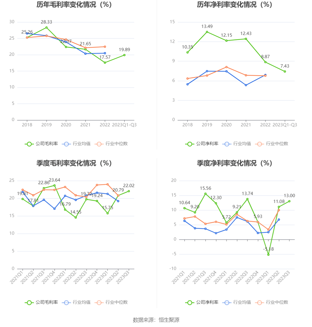 2023年前三季度,公司毛利率为19.89%,同比上升2.89个百分点;净利率为7.43%,较上年同期下降2.43个百分点。从单季度指标来看,2023年第三季度公司毛利率为22.02%,同比上升2.30个百分点,环比上升1.23个百分点;净利率为13.00%,较上年同期下降0.74个百分点,较上一季度上升1.92个百分点。