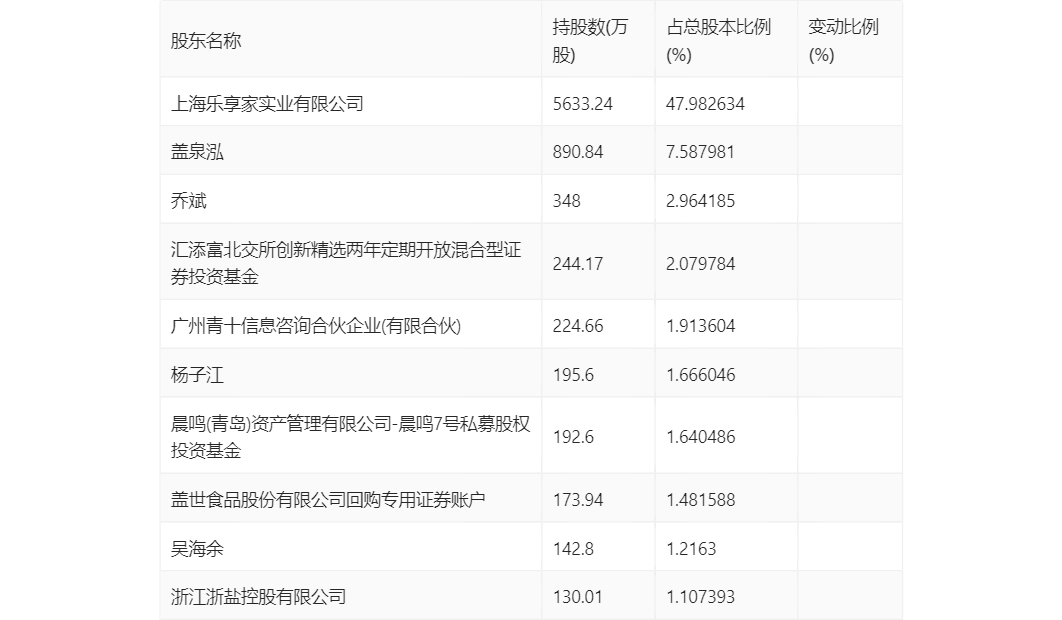 三季报显示,2023年三季度末公司十大股东中,新进股东为盖世食品股份有限公司回购专用证券账户,取代了上半年末的林春棋。在具体持股比例上,晨鸣(青岛)资产管理有限公司-晨鸣7号私募股权投资基金、吴海余持股有所上升,汇添富北交所创新精选两年定期开放混合型证券投资基金、广州青十信息咨询合伙企业(有限合伙)、杨子江、浙江浙盐控股有限公司持股有所下降。