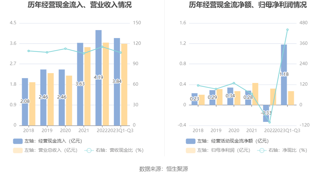 2023年前三季度,公司营业收入现金比为106.74%,净现比为441.37%。