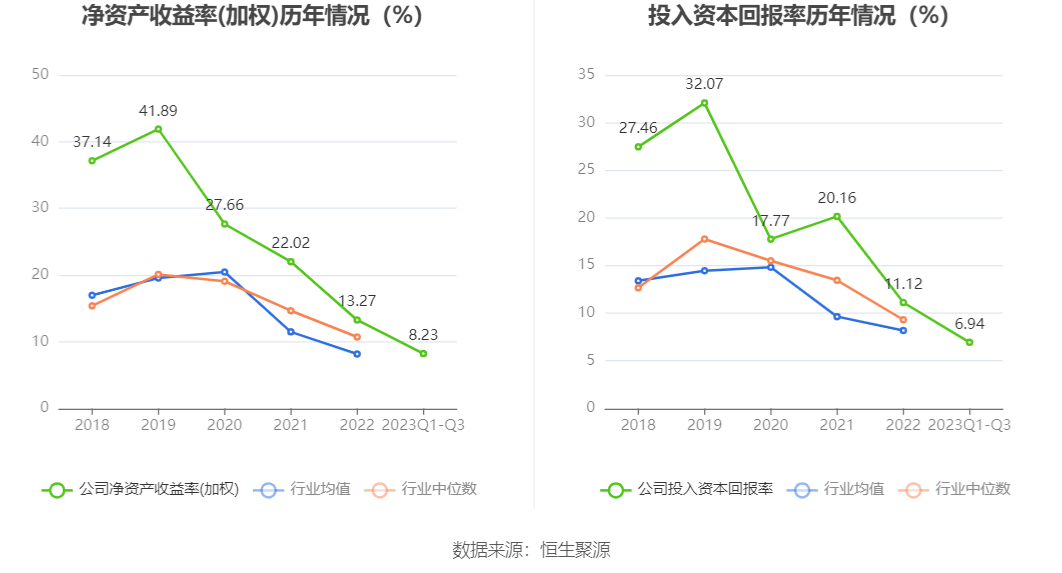 数据显示,2023年前三季度公司加权平均净资产收益率为8.23%,较上年同期下降3.72个百分点;公司2023年前三季度投入资本回报率为6.94%,较上年同期下降2.57个百分点。