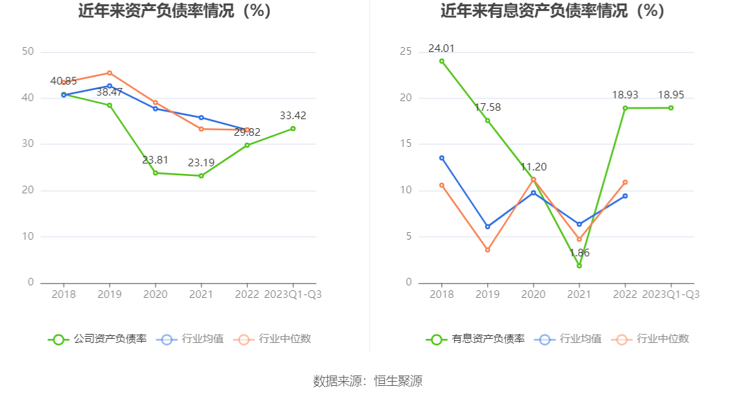 在偿债能力方面,公司2023年三季度末资产负债率为33.42%,相比上年末上升3.60个百分点;有息资产负债率为18.95%,相比上年末上升0.02个百分点。