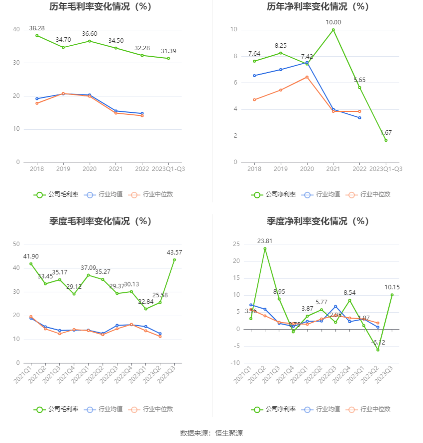 2023年前三季度,公司毛利率为31.39%,同比下降2.12个百分点;净利率为1.67%,较上年同期下降2.32个百分点。从单季度指标来看,2023年第三季度公司毛利率为43.57%,同比上升14.20个百分点,环比上升17.99个百分点;净利率为10.15%,较上年同期上升8.10个百分点,较上一季度上升16.27个百分点。
